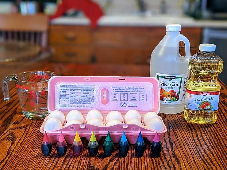Gather your supplies, you will need hot water, white vinegar, food coloring, and vegetable oil. You will also want a few jars to color your eggs in, my family likes to use mugs best.